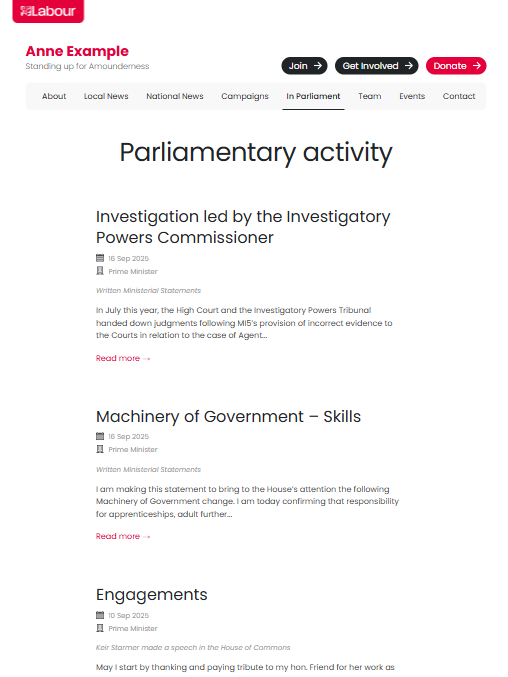 - Essential plug-ins and tools – from event listings and optimisied local donation buttons, to feeds showing your latest parliamentary activity or local campaigning events.